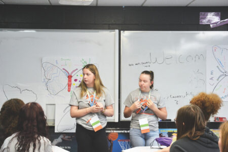(Photo by Douglass Huxley) Belpre High School senior Elizabeth (Liz) Morrison, left, and junior Bella Morrison lead a session Friday about personal growth and leadership traits using the metamorphosis of a butterfly during the 73rd annual Ohio Association of Student Leaders State Conference.
