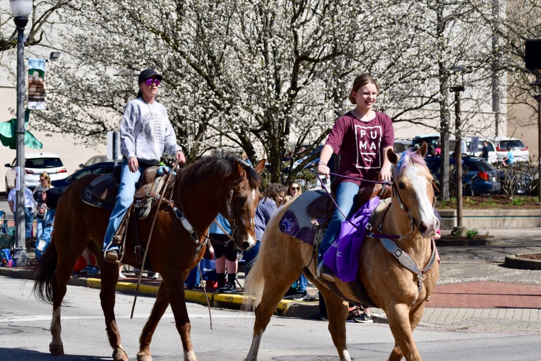 - (Photo by Amber Phipps) Two girls ride horses during the 16th annual Mid-Ohio Valley Easter Parade Saturday.