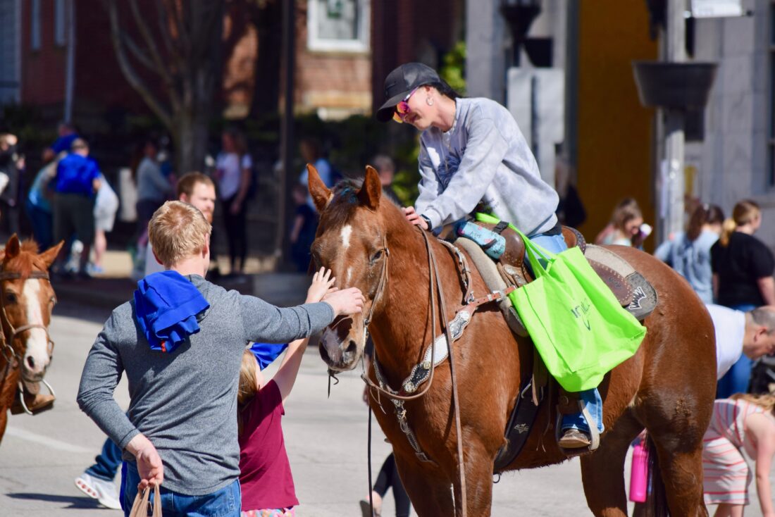 (Photo by Amber Phipps) People attending the 16th annual Mid-Ohio Valley Easter Parade along Market Street pet a horse during the parade Saturday.