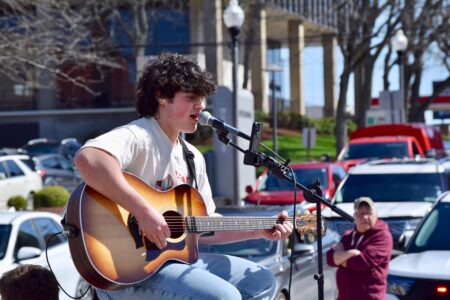 (Photo by Amber Phipps) Parkersburg native and American Idol golden ticket winner, Luke Colombo, sings on his float during that 16th annual Mid-Ohio Valley Easter Parade Saturday.