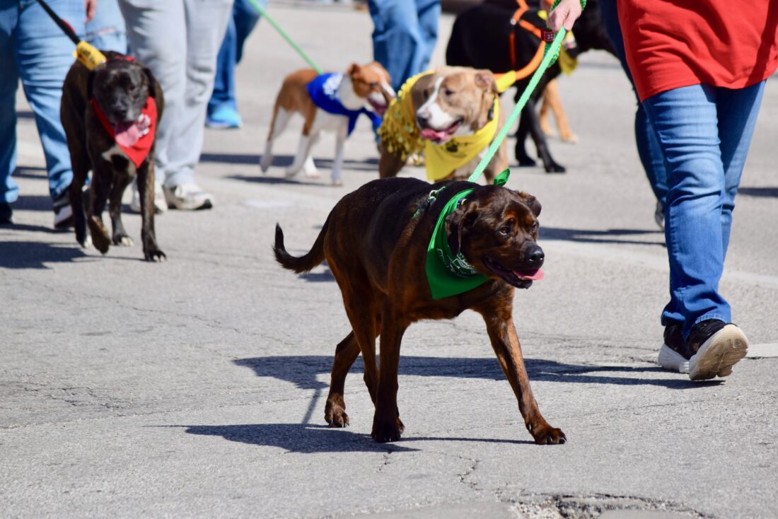 (Photo by Amber Phipps) Dogs with the Humane Society of Parkersburg walk the parade route on Market Street during the 16th annual Mid-Ohio Valley Easter Parade Saturday.