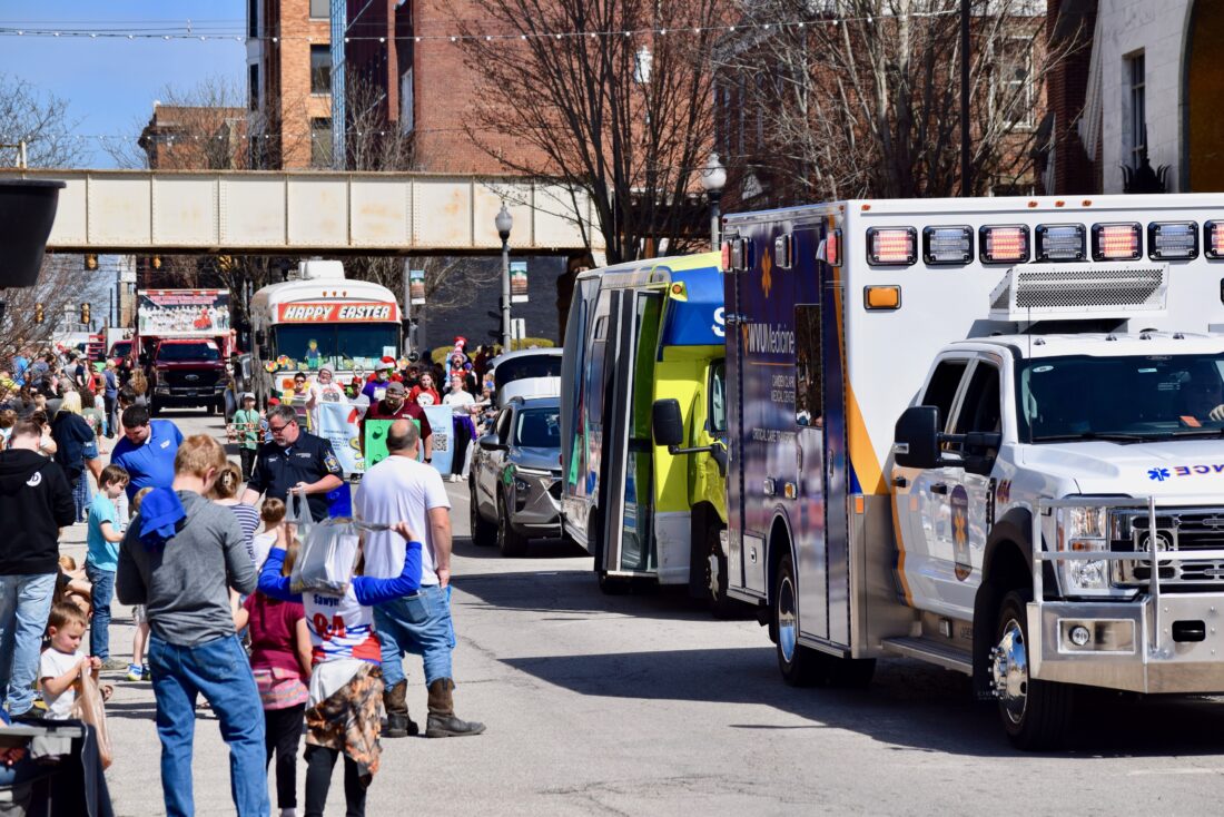- (Photo by Amber Phipps) Vehicles and floats in the 16th annual Mid-Ohio Valley Easter Parade make their way down Market Street Saturday.
