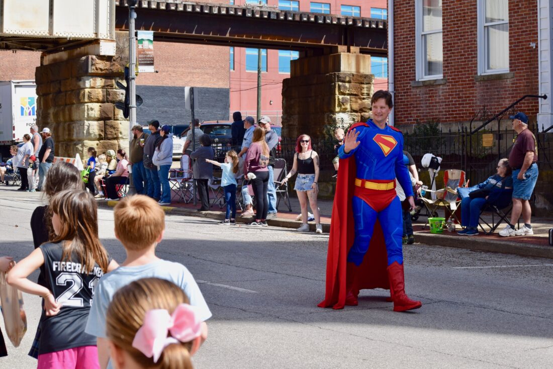 - (Photo by Amber Phipps) Superman waves to children along Market Street during the 16th annual Mid-Ohio Valley Easter Parade Saturday.