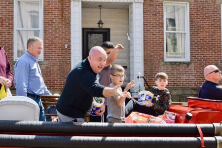 (Photo by Amber Phipps) The City of Vienna Mayor Chad Emrick tosses candy to kids along Market Street for the 16th annual Mid-Ohio Valley Easter Parade Saturday. The City of Marietta Mayor Josh Schlicher, left, smiles alongside him.