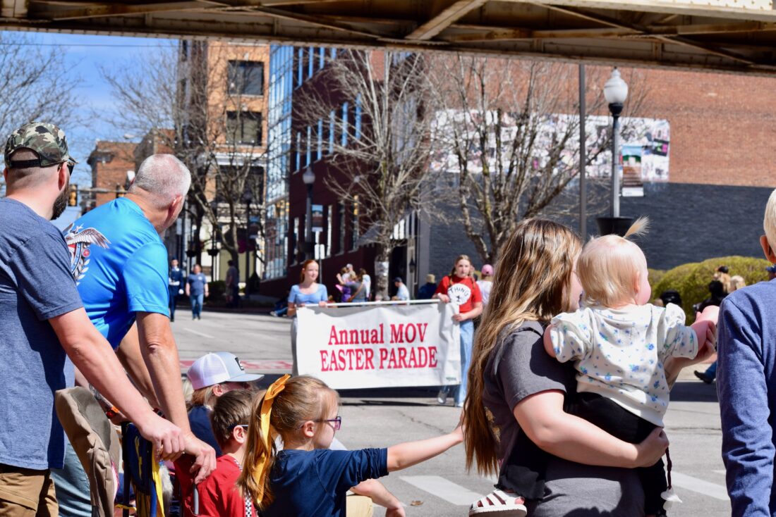 - (Photo by Amber Phipps) The Annual MOV Easter Parade sign initiates the start of the 16th annual Mid-Ohio Valley Easter Parade along Market Street Saturday afternoon.