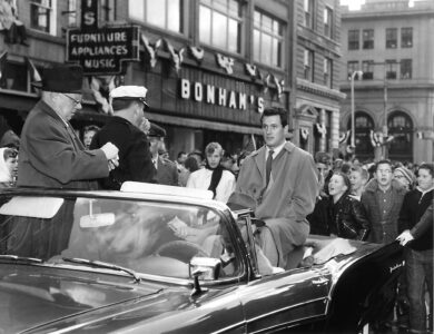 Hollywood actor Rock Hudson travels down Putnam Street in Marietta during the premiere of the film ‘Battle Hymn’ on Feb. 14, 1957. (Photo provided by Art Smith)