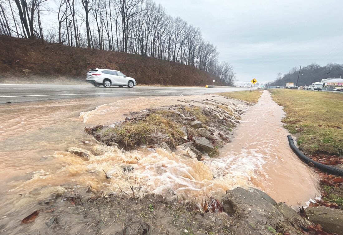 (Photo by Art Smith) Water from heavy rains overnight flow over a driveway and into a ditch along Ohio 7 between Marietta and Belpre Thursday morning.