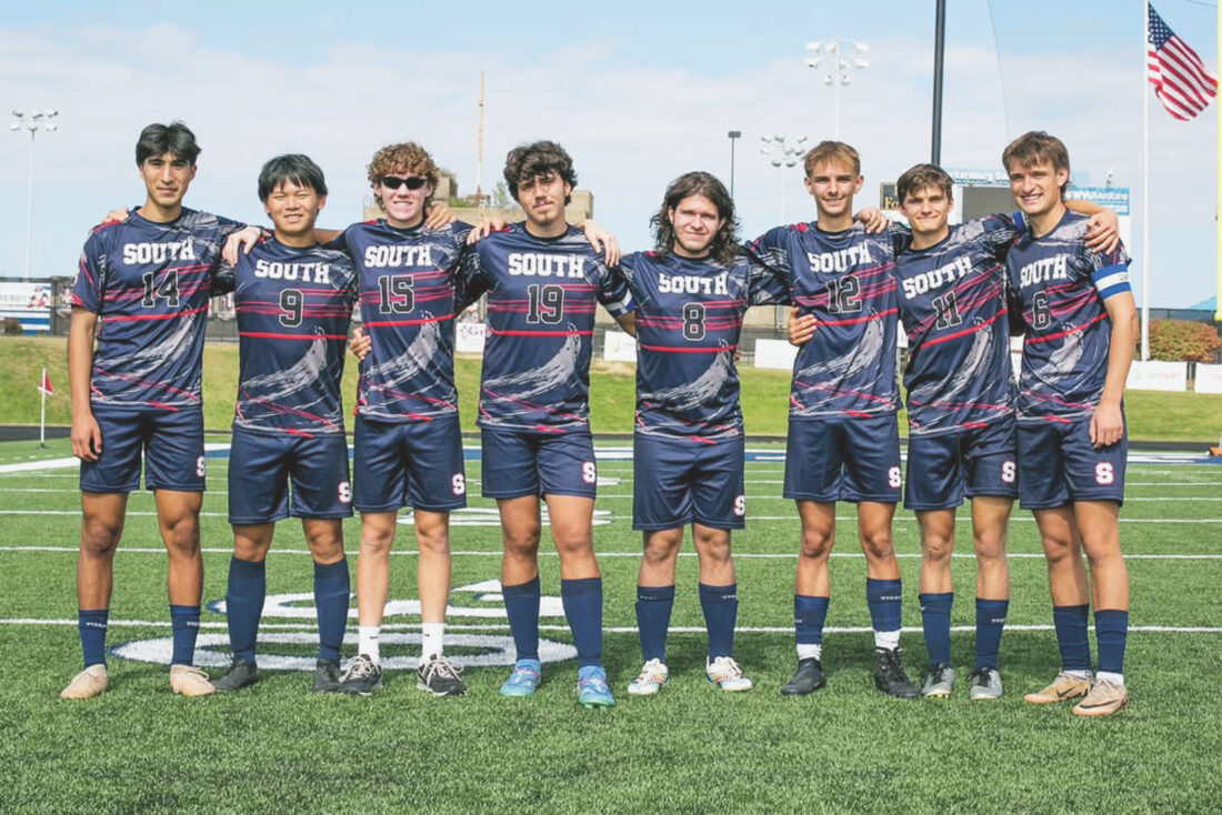 - (Photo provided) Zachary Farnsworth, second from right, poses for a picture with all of the seniors on the 2025 Parkersburg South High School boys soccer team.