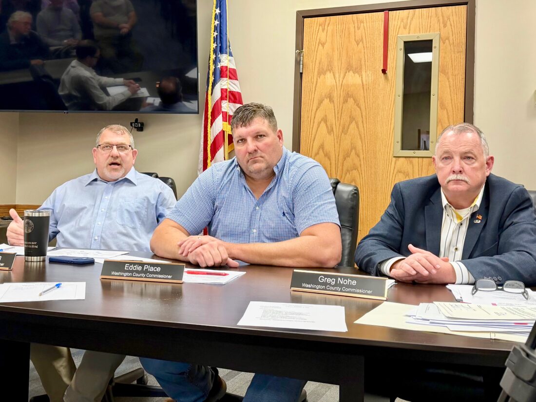 - (File Photo) Washington County Commissioner Charlie Schilling, left, responds to Waterford residents regarding the preliminary data center project during the commission’s regular meeting Feb. 12. Commissioners Eddie Place and Greg Nohe listen and respond as well.