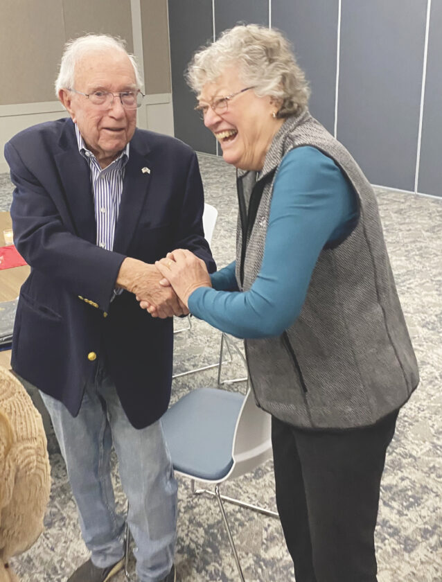 (Photo by Brett Dunlap) Wood County Commissioner Robert Tebay is congratulated by Dottie Enoch at a gathering Thursday honoring Tebay for his service on the commission. Tebay is retiring and stepping down from the commission with Thursday being his last day.