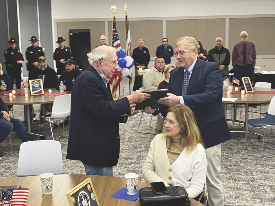(Photo by Brett Dunlap) Wood County Commissioner Robert Tebay receives a plaque from Wood County Clerk Joe Gonzales honoring his service to the county. Tebay officially stepped down from his office on Thursday as county officials held a reception at the Wood County Resiliency Center honoring Tebay’s 22 years as a county commissioner.