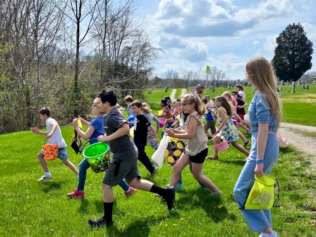 Approximately 2,000 eggs were spread across the church property for children of all ages to find. The event included designated areas for younger children near the parsonage and picnic shelter, while older participants searched in other sections of the grounds.