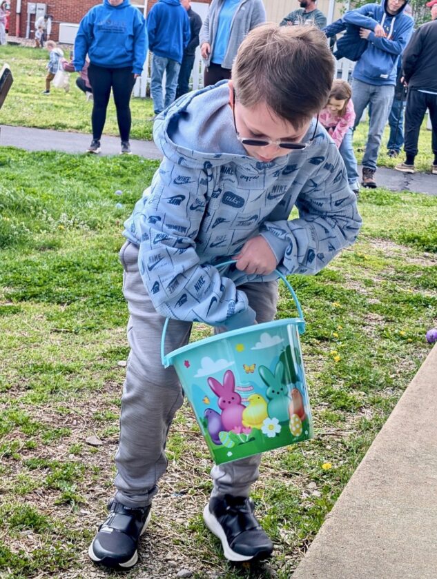 (Photo by Evan Bevins) Aiden Clayton, 8, of Roxboro, N.C., gathers eggs during the Oak Grove Volunteer Fire Department Easter egg hunt Sunday at the Oak Grove Recreation Center. Clayton and his family were visiting his great-grandmother for the holiday.
