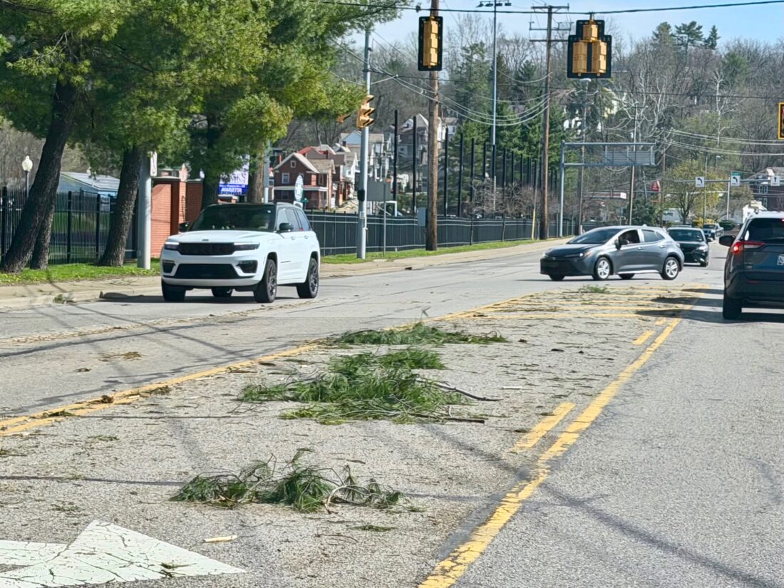(Photo by Art Smith) Debris from the storm Wednesday night strewn across Pike Street in Marietta Thursday morning.