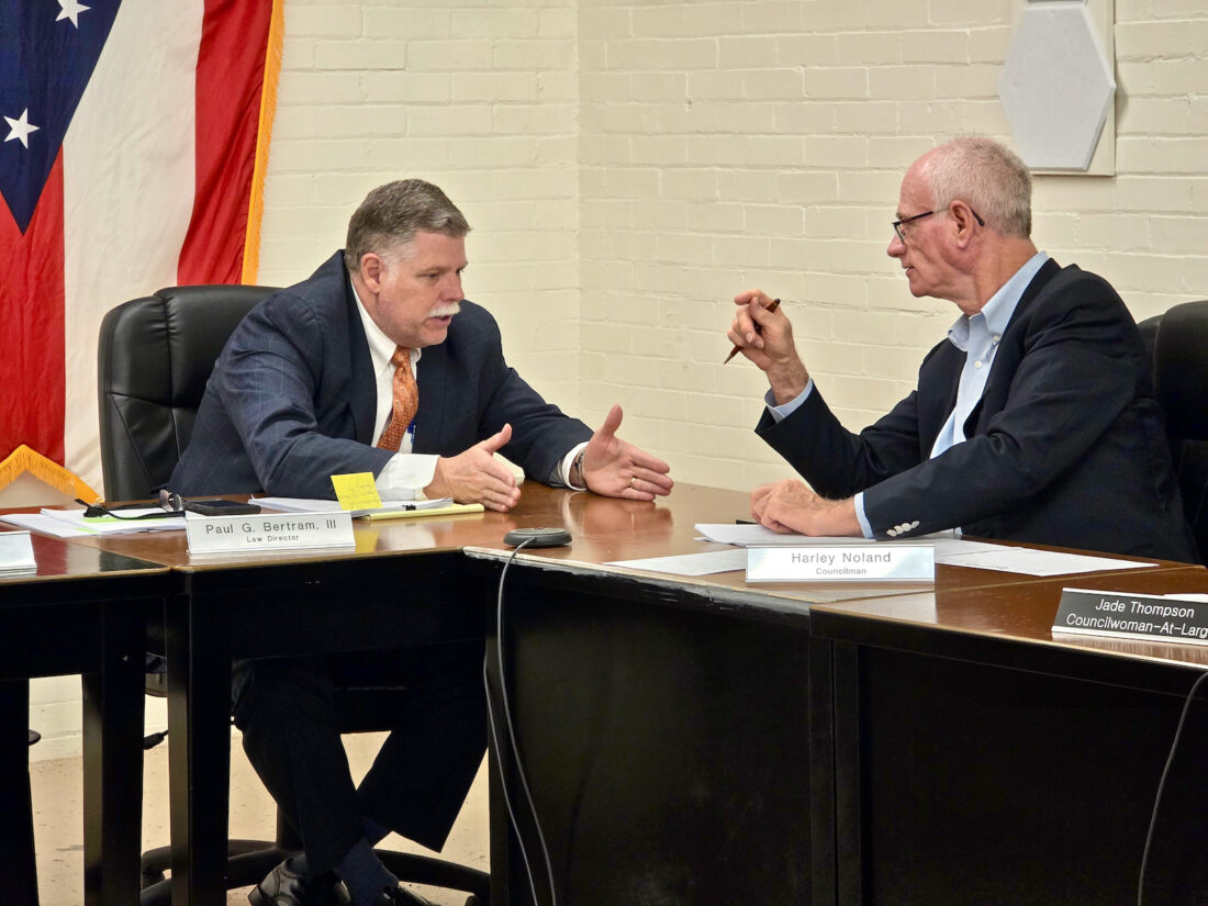 From left, Marietta Law Director Paul Bertram and City Councilman Harley Noland discuss legislation prior to the start of Thursday’s Marietta City Council meeting. Read more in the weekend edition of The Marietta Times or online at mariettatimes.com. (Photo by Gwen Sour)