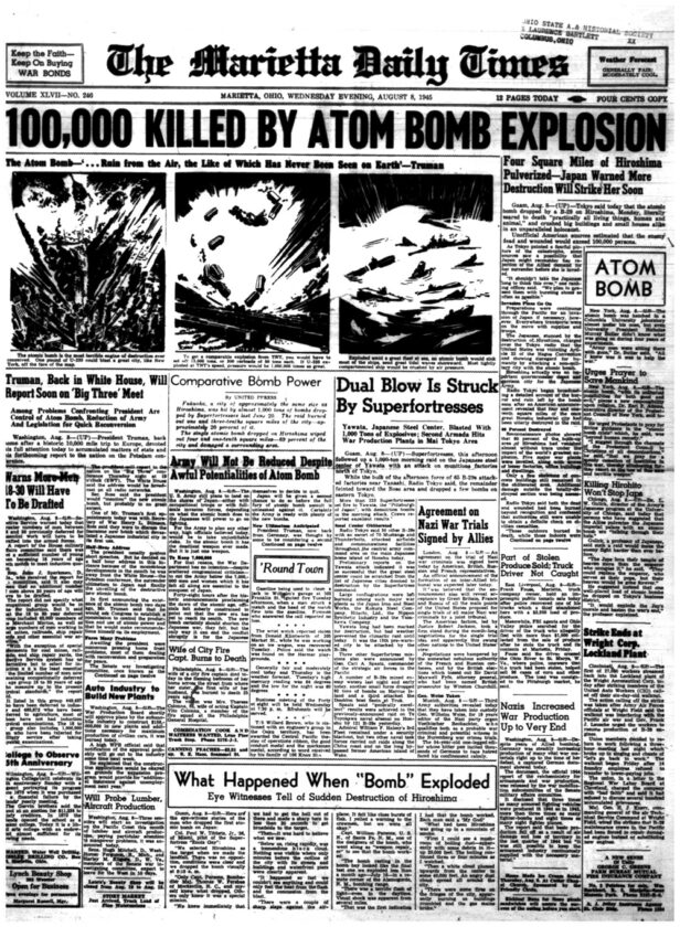 The lead story got right to the point “Tokyo said today that the atomic bomb dropped by a B-29 on Hiroshima, Monday, literally seared to death practically all living things, human and animal,” and crushed big buildings and small houses alike in an unparalleled holocaust.”