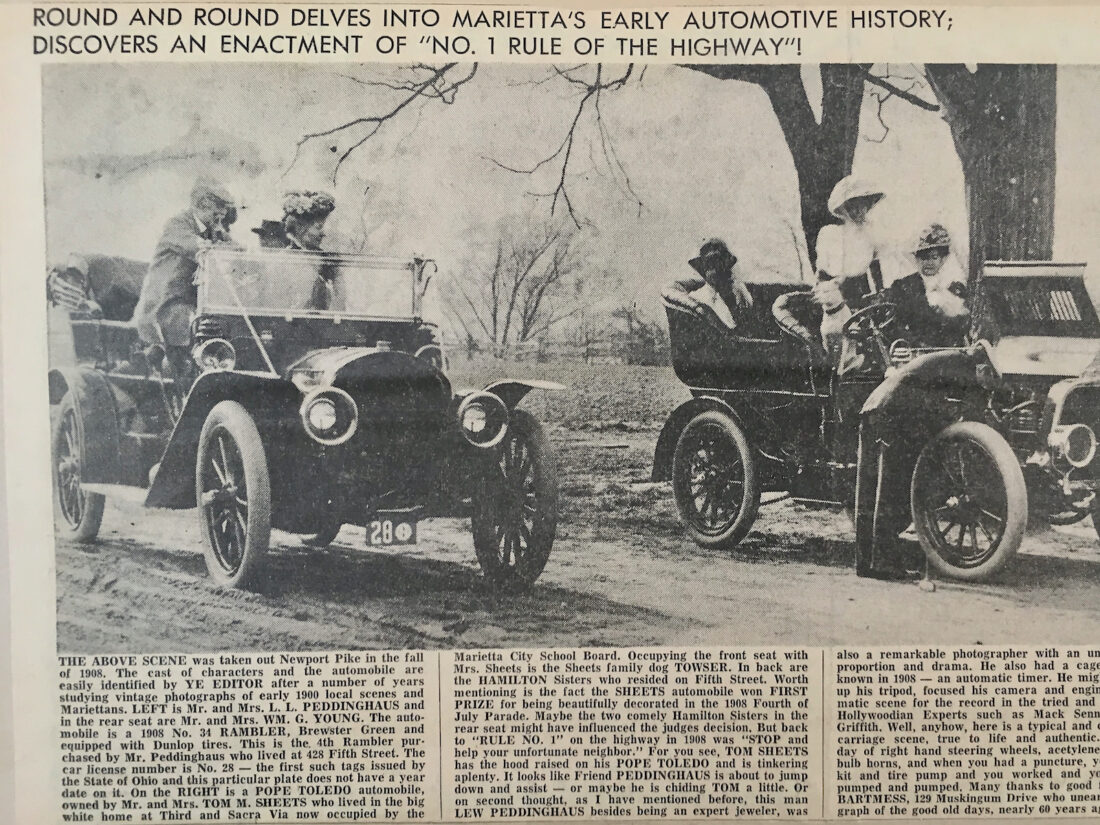 You could say L. L. “Lew” Peddinghaus was an early 1900s pioneer – as owner/operator of an automobile. Hardly anyone owned an automobile in 1900-1910. Peddinghaus operated a Marietta jewelry store at 187 Front Street (which became Baker & Baker Jewelers in 1918). He was able to afford new cars every year or so, unusual at the time.