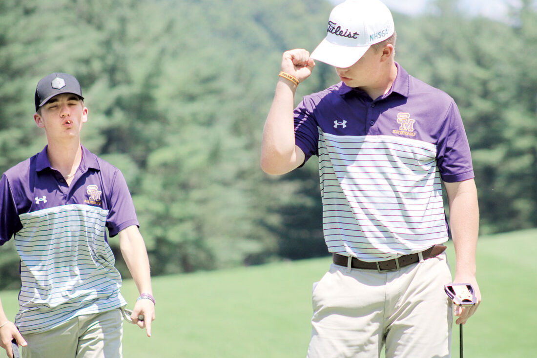 Photo by Kerry Patrick St. Marys golfer Trent Renner gives a fist pump after converting a birdie putt on the third hole at North Bend Golf Course during Wednesday’s Little Kanawha Conference Scramble. St. Marys successfully defended its title by finishing at 15-under 57.