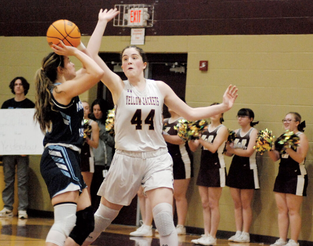 Williamstown’s Faith Pickens, who finished with game-highs of 25 points, 19 rebounds and four blocks, challenges a shot by Parkersburg Catholic’s Izzy DeAngelo during the Yellowjackets’ 67-49 victory Friday night. (Photo by Jay W. Bennett)