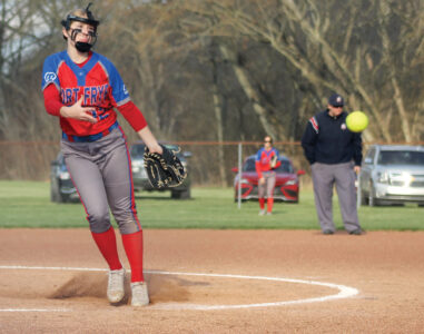 - Frontier’s Haylee Berentz delivers a pitch during a high school softball game against Fort Frye Thursday in Beverly. (Photo by Aaron Lee)