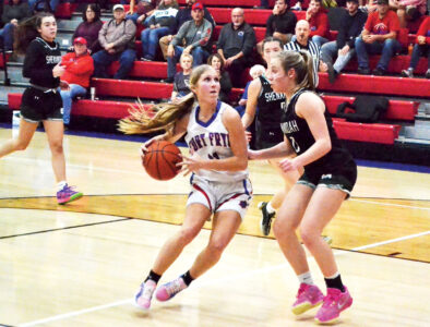 - Fort Frye’s Emmie Duskey, left, attacks the basket as Shenandoah’s Emily Moore defends during Monday’s game in Beverly. (Photo by Mike Morrison)