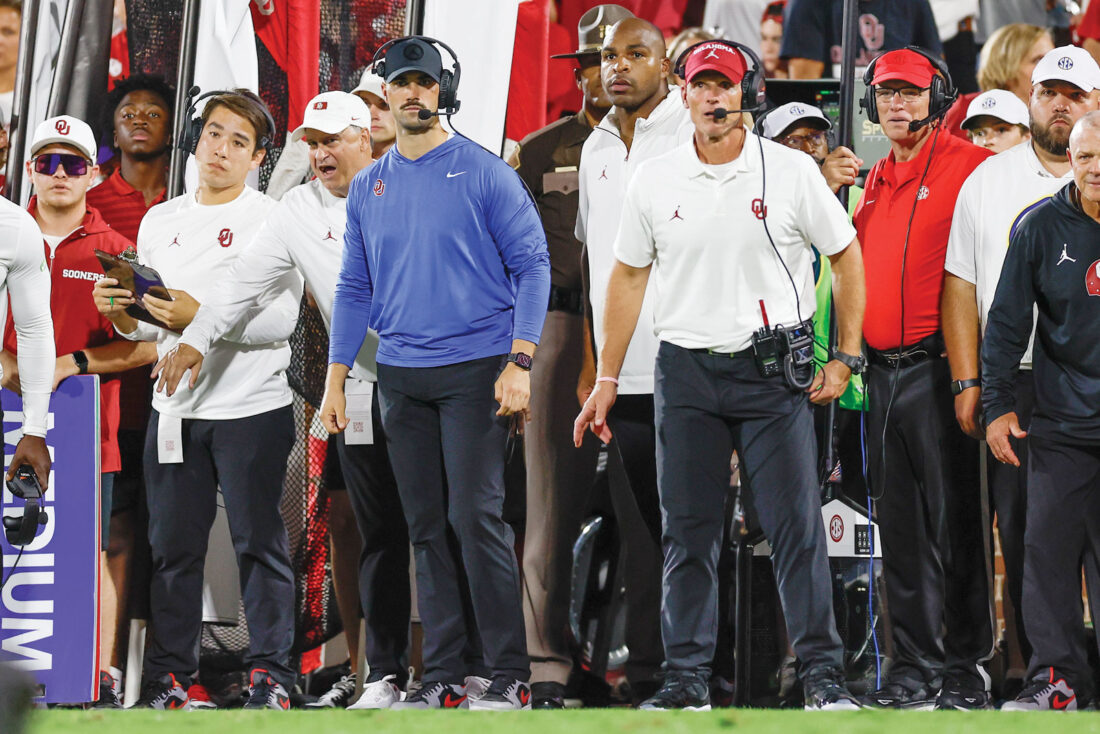 Oklahoma co-defensive coordinator Zac Alley, left, and head coach Brent Venables, right, watch their team play against Tennessee during the first half of an NCAA football game in Norman, Okla. (AP Photo)