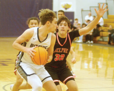 - Ritchie County’s Isaac Hodges, left, looks to pass as Belpre’s Malakai Ensor defends during Saturday’s St. Marys High School Invitational championship game. (Photo by Jordan Holland)