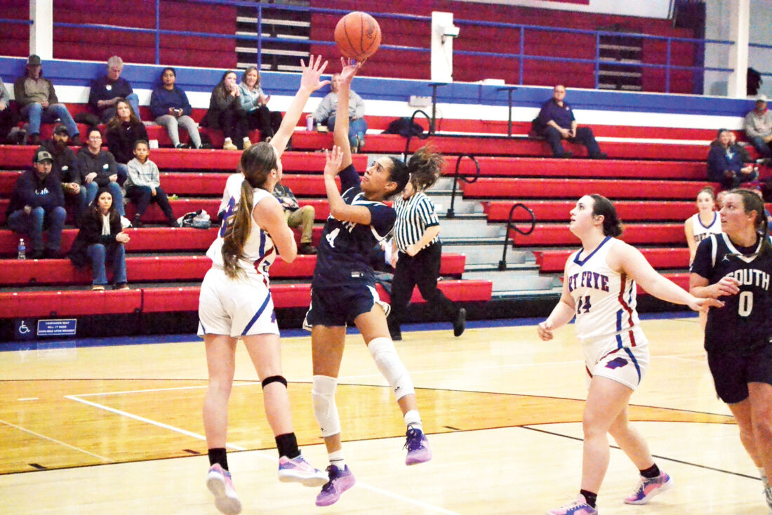 - Parkersburg South’s Macy Singer (4) shoots over a Fort Frye defender during Tuesday’s game in Beverly. (Photo by Mike Morrison)