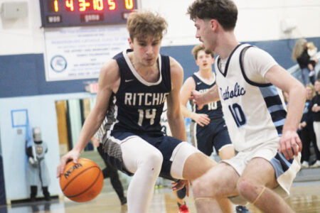 Parkersburg Catholic’s Preston Randolph (10) applies defensive pressure on Ritchie County’s Isaac Hodges (14) during Tuesday’s game in Parkersburg. Hodges scored a game-high 36 points as the Rebels won, 70-50. (Photo by Kerry Patrick)