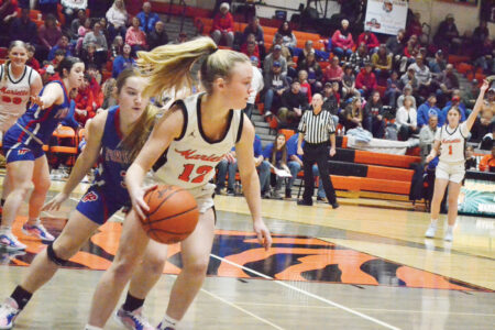 - Marietta’s Jacey McKnight (12) handles the ball during a game against Fort Frye Thursday at Sutton Gym. (Photo by Mike Morrison)