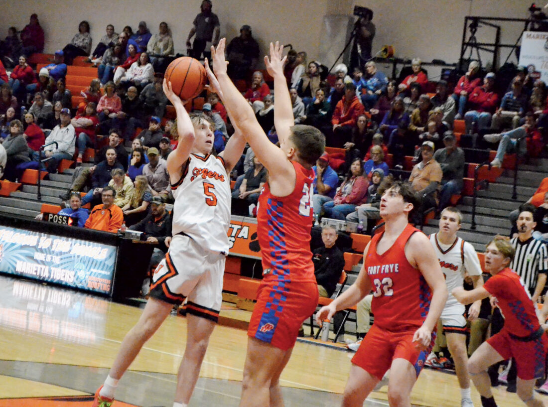 - Marietta’s Trey Hawkins (5) pulls up for a jumper as Fort Frye’s Kainan Bradford (24) contests during Thursday’s game at Sutton Gym. (Photo by Mike Morrison)
