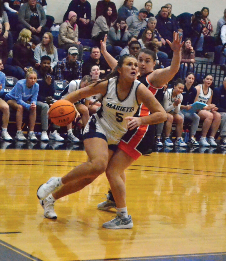 - Marietta College’s Payten Bruns (5) drives baseline during the Pioneers’ game aginst Ohio Northern, Sunday in Marietta. (Photo by Mike Morrison)