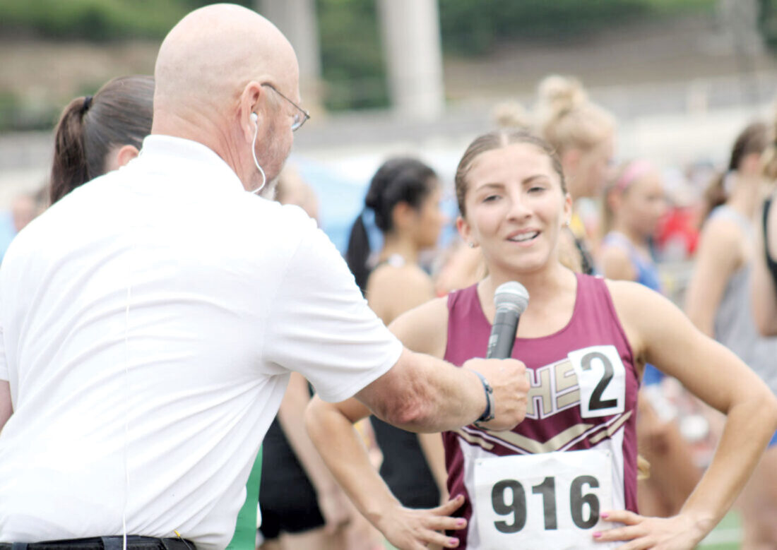 Williamstown’s Alyssa Sauro, right, does an interview during last year’s state track meet in Charleston. Sauro was named the McCoy Female Track Athlete of the Year. (Photo by Kerry Patrick)