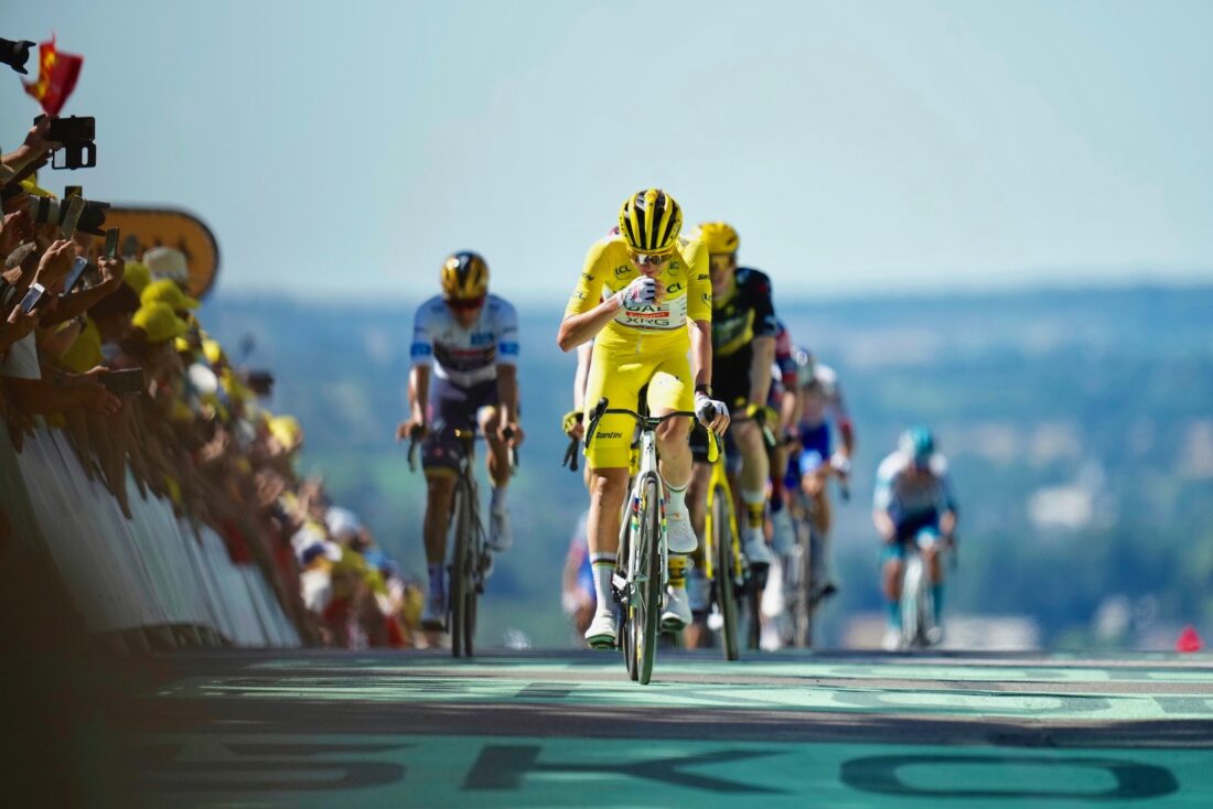 - Slovenia’s Tadej Pogacar wearing the overall leader’s yellow jersey crosses the finish line during the sixth stage of the Tour de France cycling race over 201.5 kilometers (125.2 miles) with start in Bayeux and finish in Vire Normandy, France, Thursday, July 10, 2025. (AP Photo/Mosa’ab Elshamy)