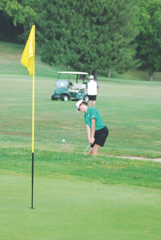 - Waterford’s Brock Hurley chips onto a green during a high school golf match earlier this season at Lakeside Golf Course. (Photo by Jay W. Bennett)
