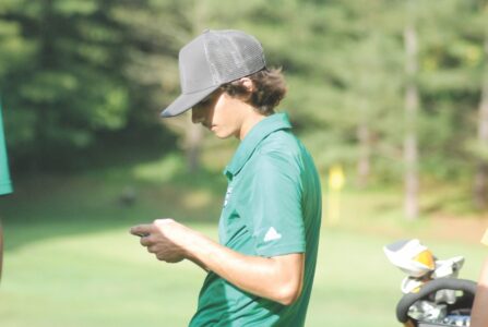 - Waterford’s Briceson Cline takes a moment between swings during a high school golf match earlier this season at Lakeside Golf Course. (Photo by Jay W. Bennett)