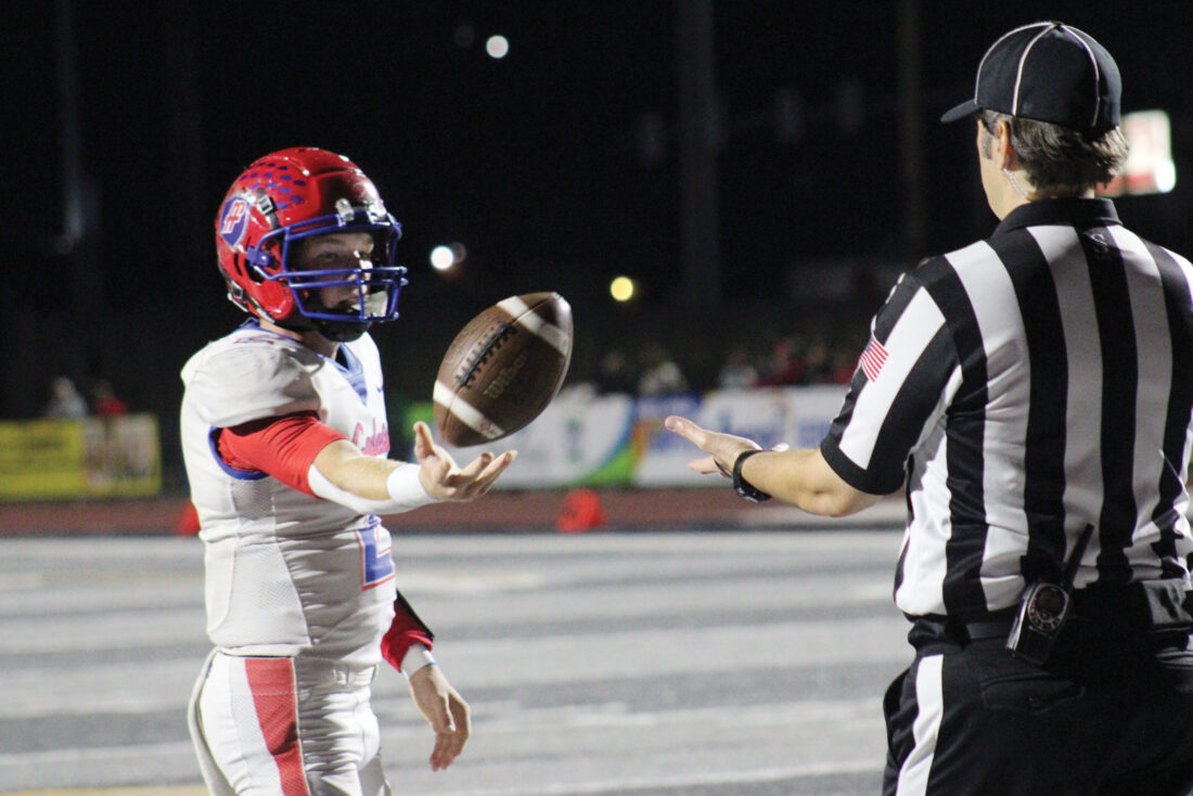 - Fort Frye’s Grady Hesson hands the ball to an official after scoring a touchdown against Marietta Friday at Don Drumm Stadium. (Photo by Kerry Patrick)