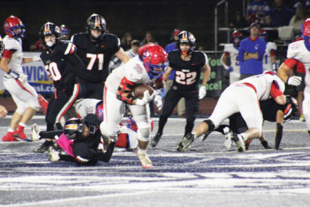 - Fort Frye’s Kainan Bradford (10) runs through a tackle during Friday’s game against Marietta at Don Drumm Stadium. (Photo by Kerry Patrick)