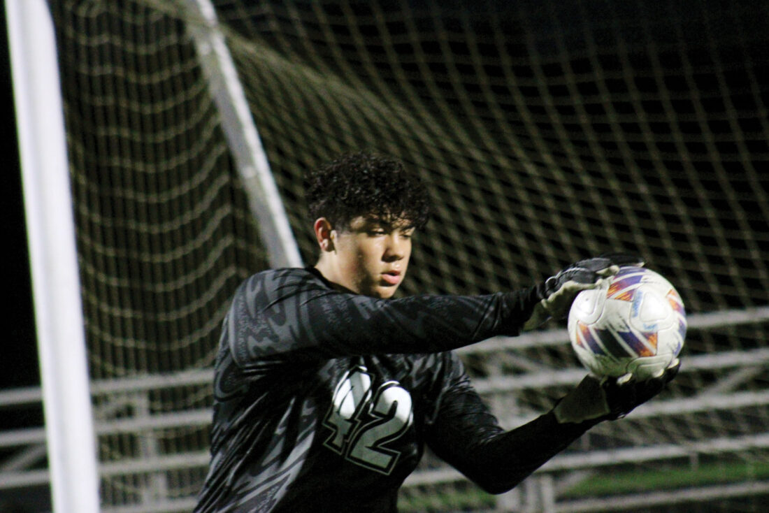 Warren goalkeeper Jonah Hollis works on his technique prior to the start of Tuesday’s high school boys soccer match with Alexander in Vincent. (Photo by Kerry Patrick)