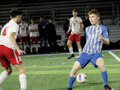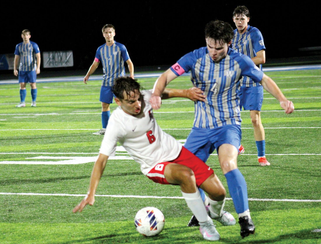 - An Alexander defender falls to the ground as Warren’s Ashton Barrow tracks down a loose ball during Tuesday’s high school boys soccer match at Warren High School. (Photo by Kerry Patrick)