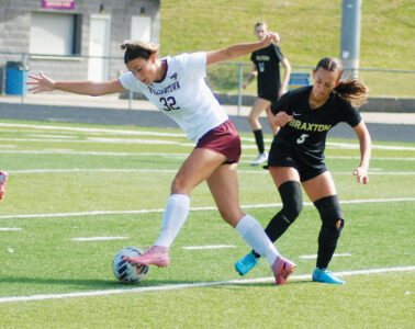 - Braxton County’s Bella Rollyson and Williamstown’s Kadence Bandy make a play on the ball during the Eagles’ 2-0 Little Kanawha Conference championship match victory Saturday at Bill Hanlin Stadium in St. Marys. (Photo by Jay W. Bennett)