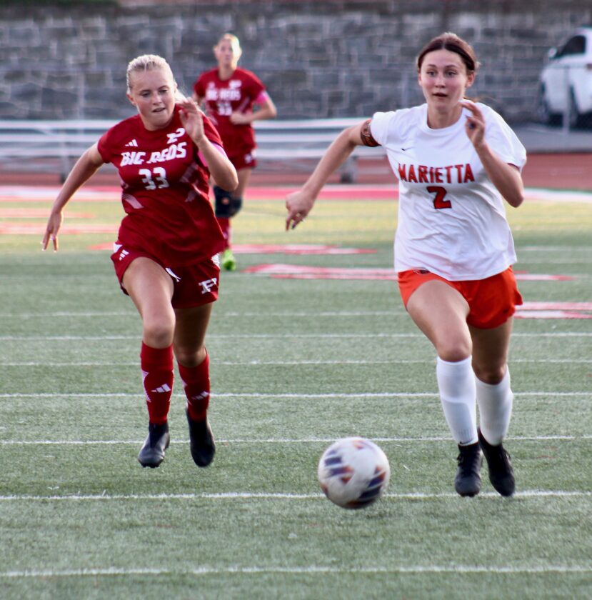 PARKERSBURG — “It’s huge!” – simply put by Parkersburg junior Hailey Warman, the Big Reds’ 2-1 win over Marietta in a high school girls soccer match, Tuesday night at Stadium Field.