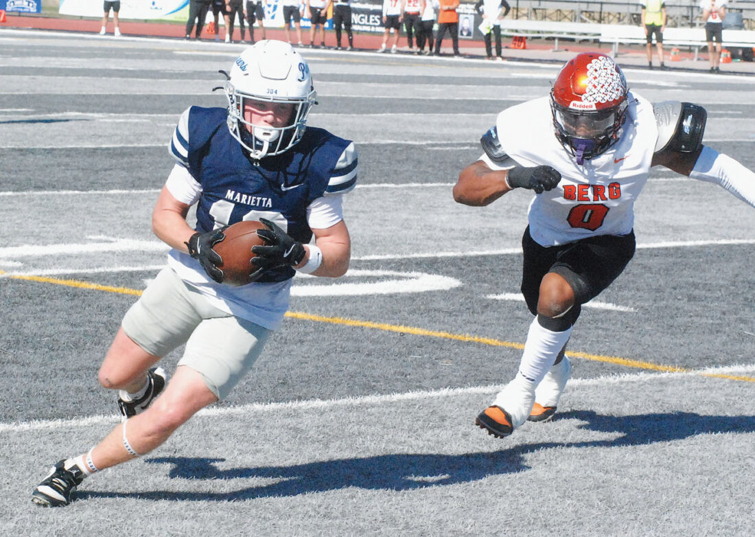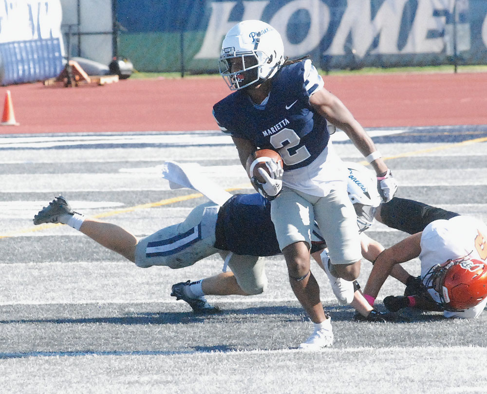 Instead of leading 28-7, the Pioneers were up just 21-14 at the break after both teams traded interceptions at the end of the second quarter — one by Heidelberg’s Xavier Weaver and one by Marietta’s Jaylen Tinsley.
