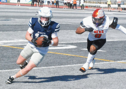 - Marietta College’s Chrys Taylor runs after a catch during Saturday’s game against Heidelberg at Don Drumm Stadium. (Photo by Jordan Holland)