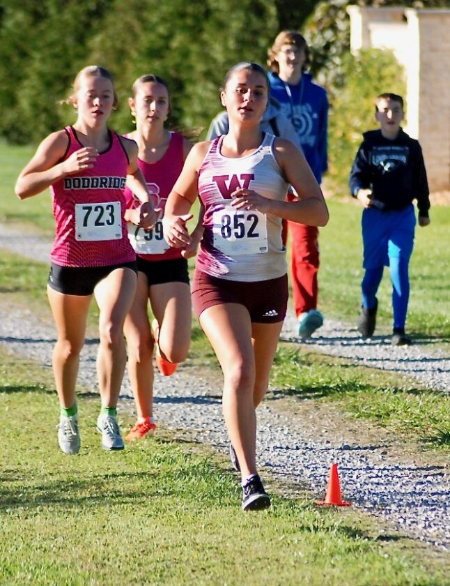 - Williamstown’s Cassie Sites, pictured here running in front of Doddridge County’s Emily Cottrill and St. Marys’ Savana Burd, won Thursday’s Little Kanawha Conference championship with a victorious time of 18 minutes and 54 seconds. (Photo by Jay W. Bennett)