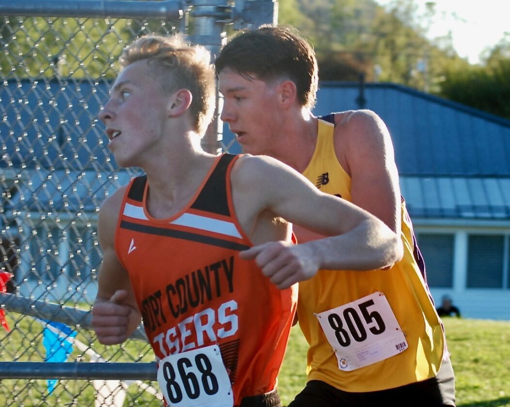 Wirt County's Matthew Balis and St. Marys' Bryce Bills hit the track at Bill Hanlin Stadium during the end of Thursday's Little Kanawha Conference cross country championship. The Blue Devil finished 5.5 seconds ahead of the Tiger to claim third place. (Photo by Jay W. Bennett)