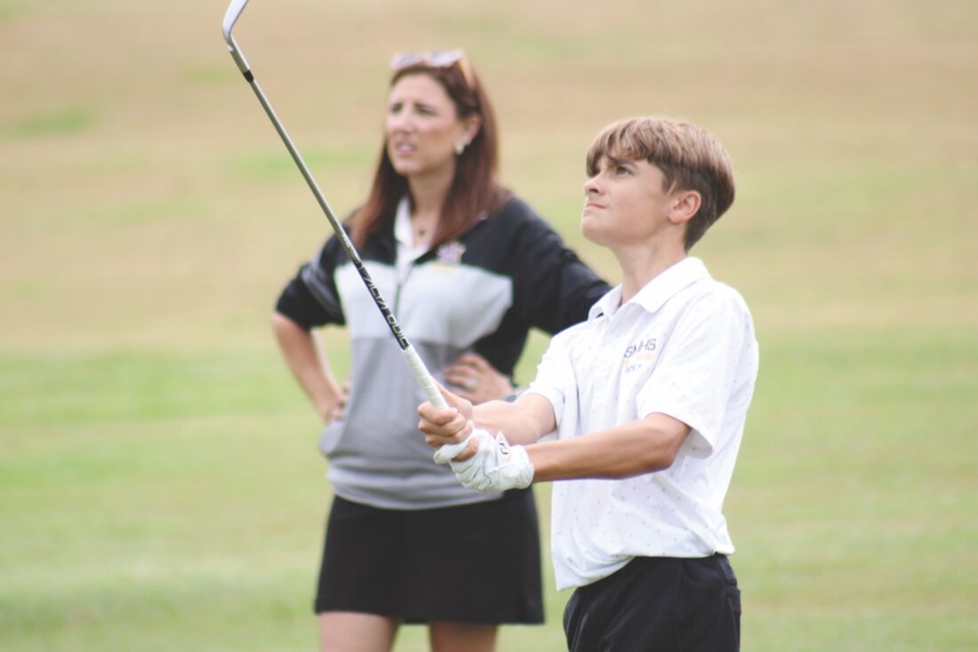 - With St. Marys golf coach Catie Hamilton watching in the background, golfer Trevor Maley hits his approach shot onto the eighth green during Monday’s Class A, Region I Tournament at Mingo Bottom Golf Course. (Photos by Kerry Patrick)