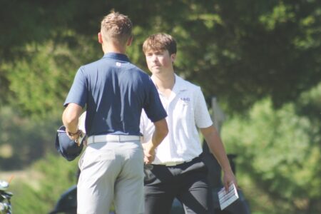 St. Marys golfer Tripp Morrison shakes hands with Ritchie County’s Carson Hall following their round at Monday’s Class A, Region I Tournament at Mingo Bottom Golf Course. (Photos by Kerry Patrick)