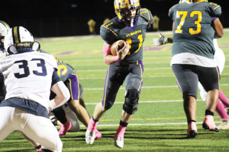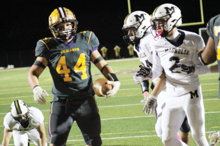 - Magnolia’s Hunter Cooley carries the ball against St. Marys during Friday’s game at Bill Hanlin Stadium. (Photo by Kerry Patrick)