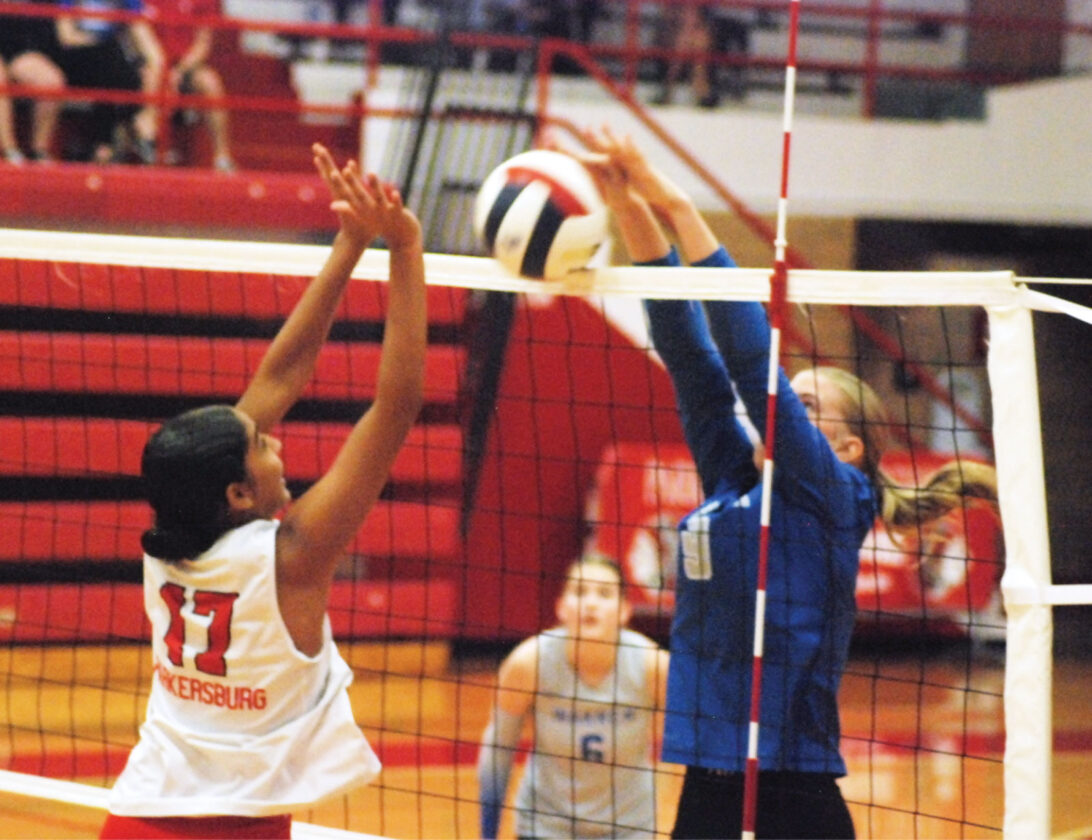 - Warren’s Taylor Greenwalt puts down a ball for a kill following a bad pass by host Parkersburg as Big Red Ily Bowman attempts a block during the Warriors’ 25-15, 25-19, 25-12 victory Tuesday night inside Memorial Fieldhouse. (Photo by Jay W. Bennett)